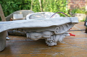 Ein Gargoyle mit leuchtenden Augen an der Wand macht das ganze etwas lebendiger. Mit LED-Solarlichtern (um die 10€) kann man die Augen im Dunkeln leuchten lassen.